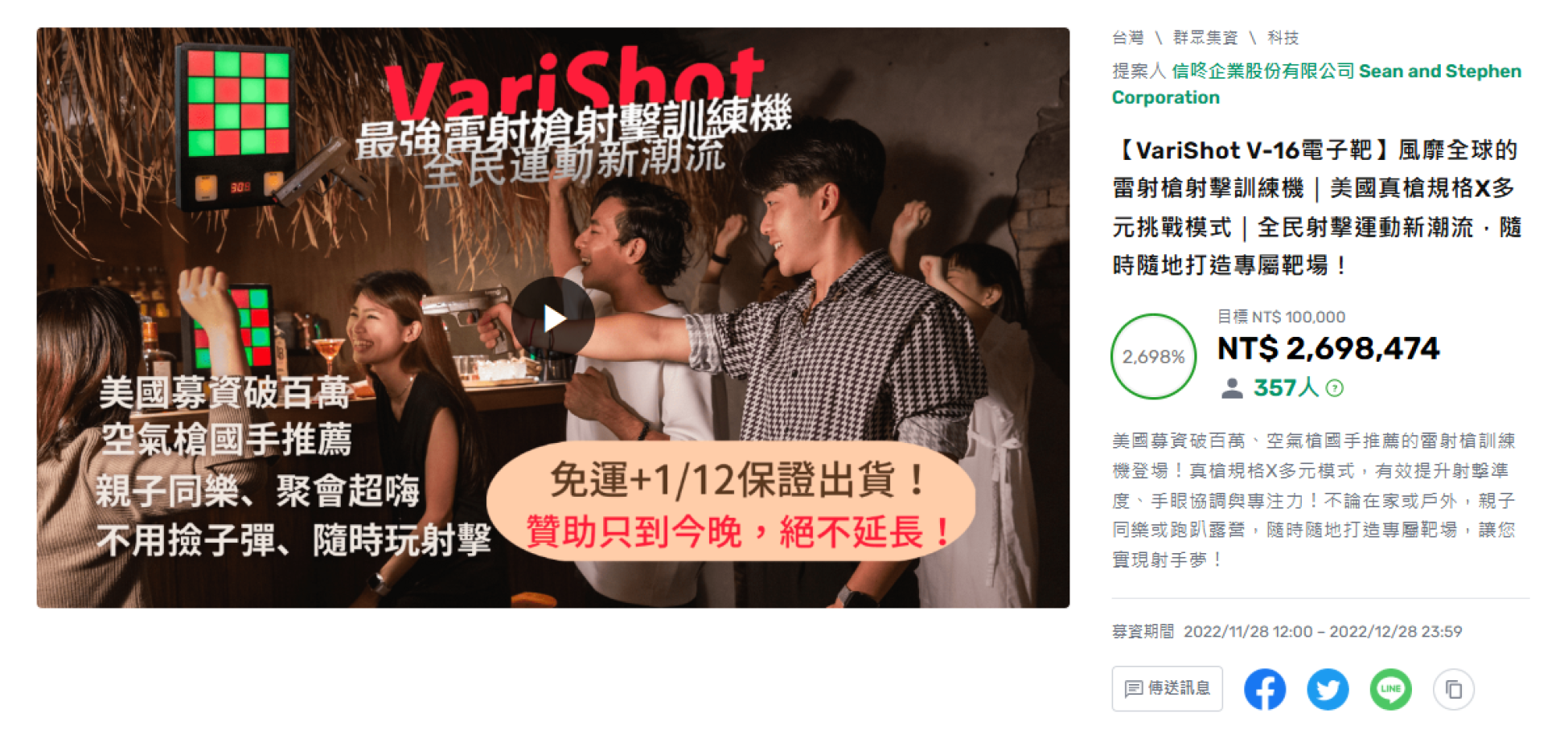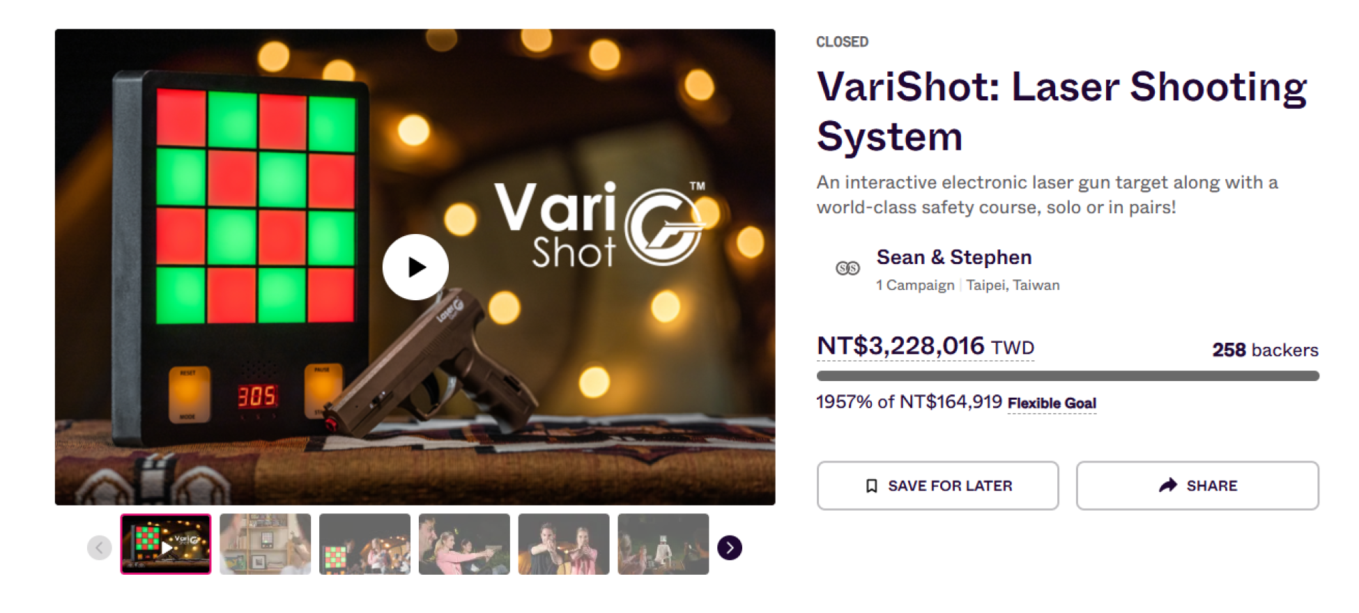 專注於提升射擊體驗的GoShot品牌,旗下第二項產品VariShot V-16電子靶去年8月首次於美國募資平台Indiegogo登場,除了美國,也有來自挪威、新加坡、澳洲等國的贊助者支持,累積募資金額近10萬美元。同年11月在台灣的募資平台嘖嘖進行募資,不僅有《聯合報》軍情站的記者來採訪,也有廣受年輕族群喜愛的玩具人來開箱,感謝粉絲的支持,最終募資金額超過2百萬台幣!